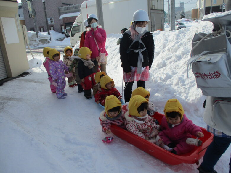 今回は、大きな地震の発生で、小学校へみんなで避難する事が目的でした。