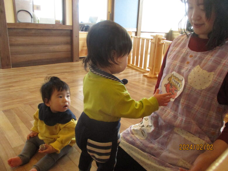 今日は節分の行事をしました。絵本を読むと、みんな真剣に見ています。