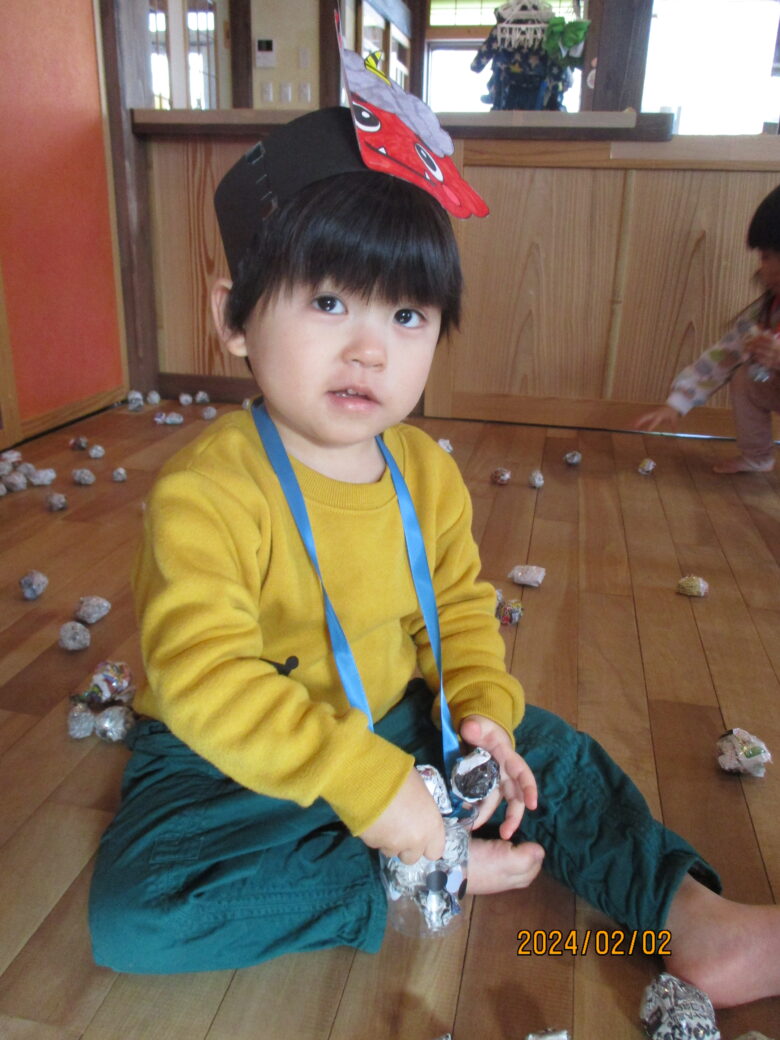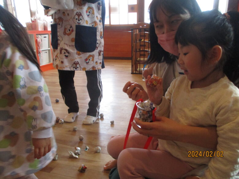 どんぐり組さんは別の部屋で豆まきをしました。