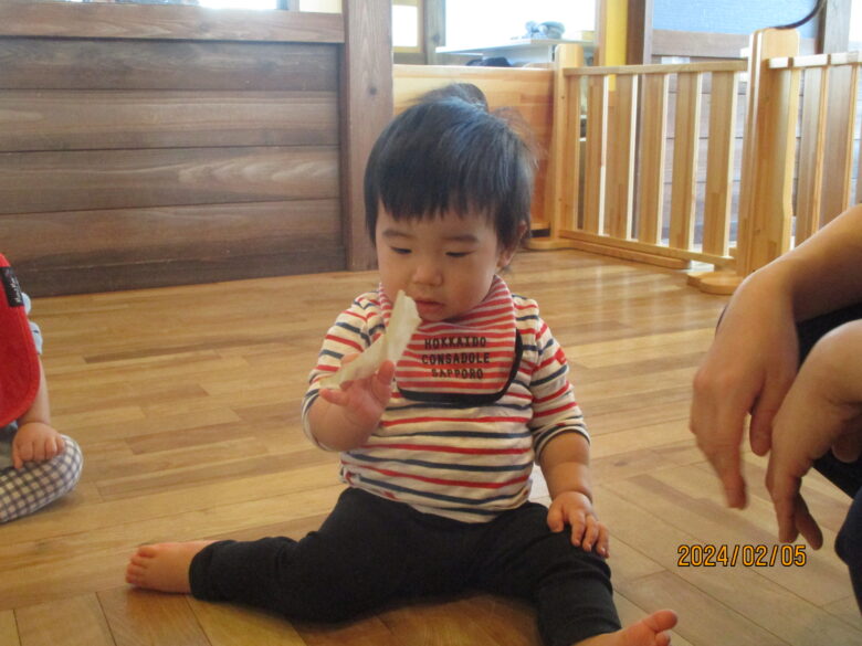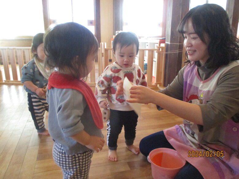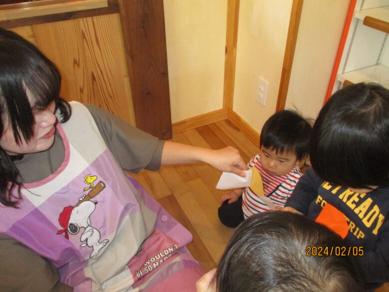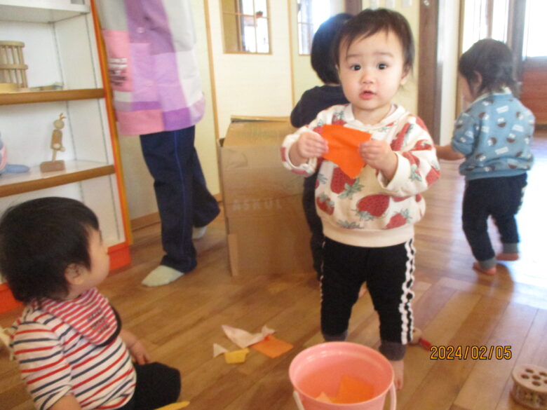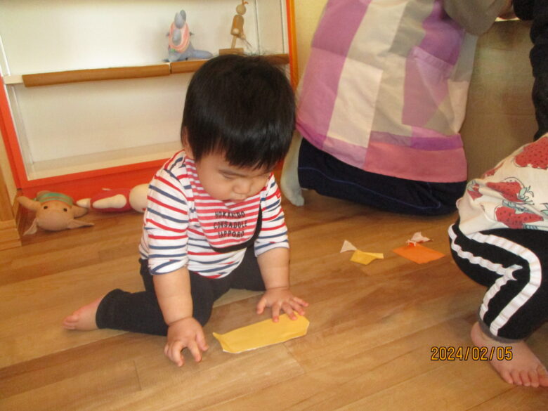 今日は黄色やオレンジと、ライオン色の折り紙を千切って遊びました。千切りやすいように切れ目を入れています。