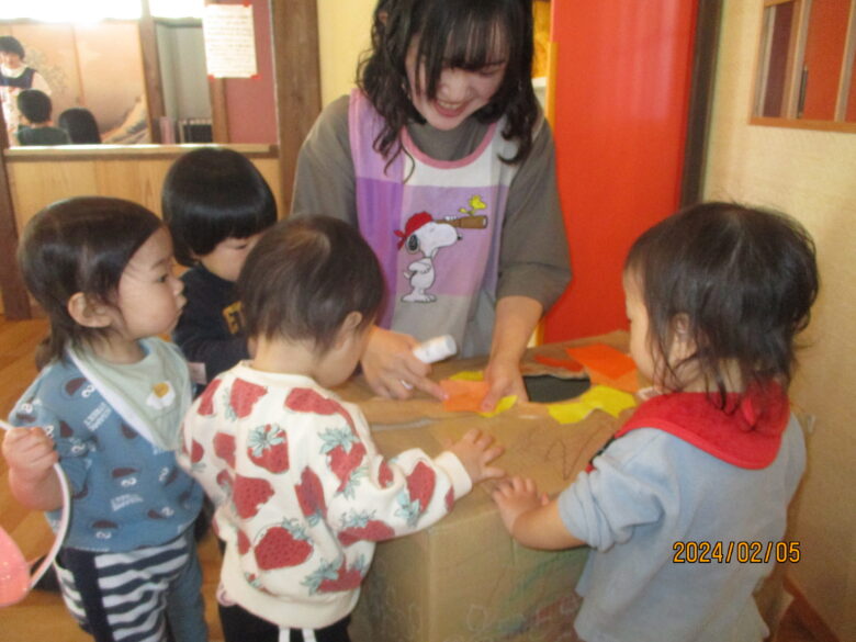 そして、子ども達に千切ってもらったものを、穴の周囲に貼って…。