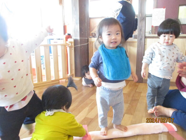 水曜、木曜の保育の様子です♪バスタオルを丸めて床に貼り付けて、その上を登り、足の裏からの感覚を楽しみました。