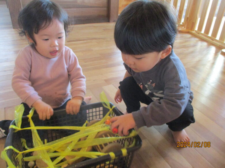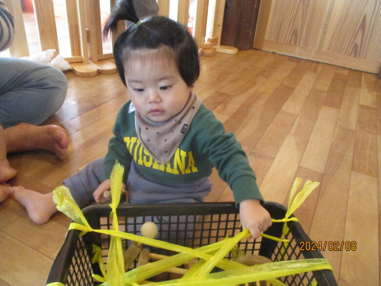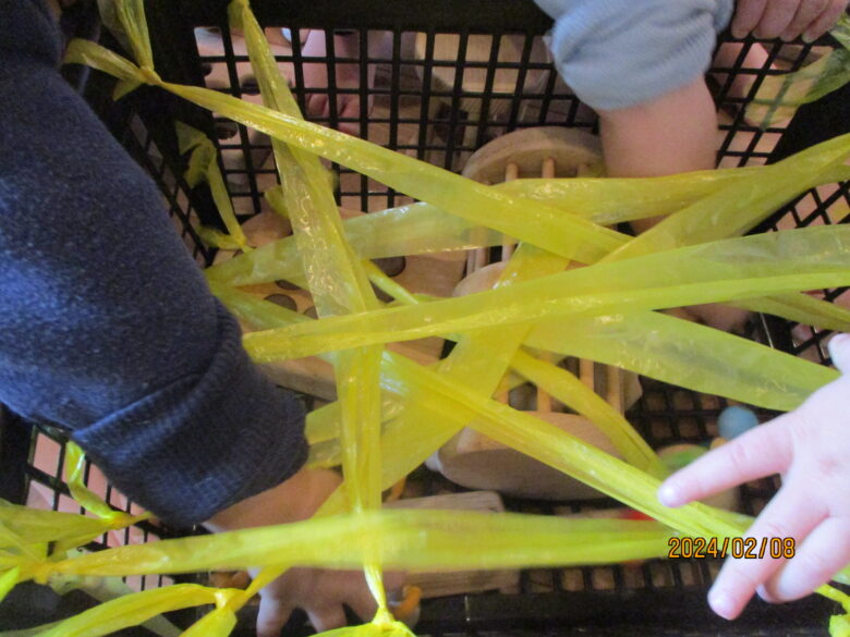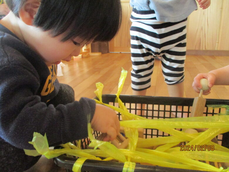 箱の中に張り巡らせたスズランテープの中に手を入れて、遊具を取り出す遊びをしました。大きな遊具は角度を変えなければならず、取り出すのが難しいです。