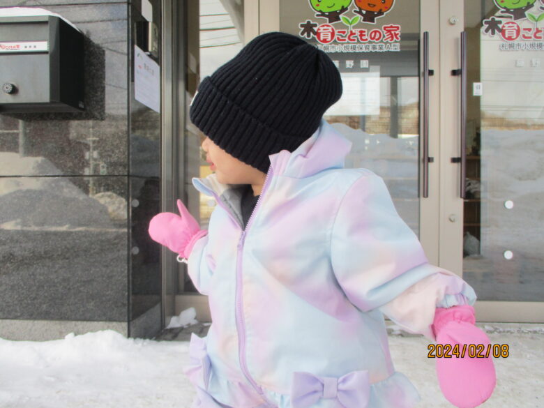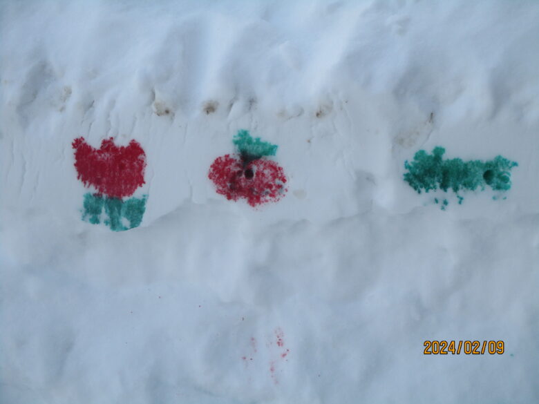 雪にお絵描きをしました。雪の色によく映えて、子どもは興味津々で見てくれましたよ!