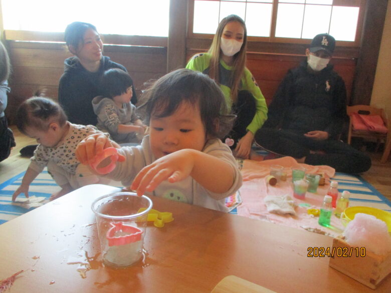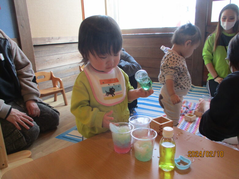 水や雪と触れ合う遊び場では、食紅水で染まった雪やペットボトルを持って忙しそうにしている子どももいました。何か美味しいものを作っているのでしょうか…。