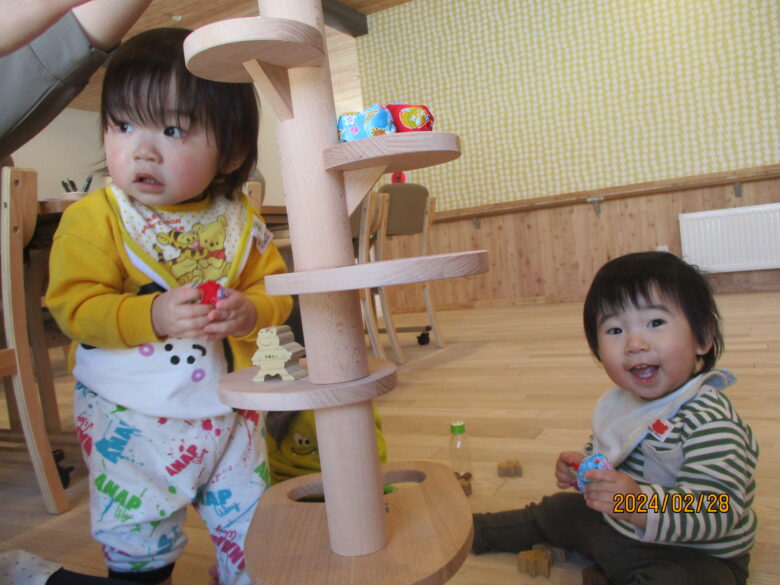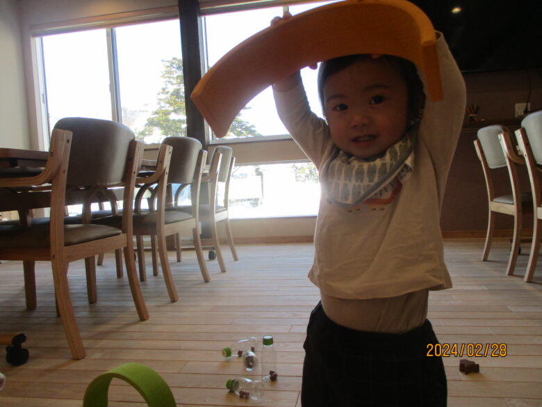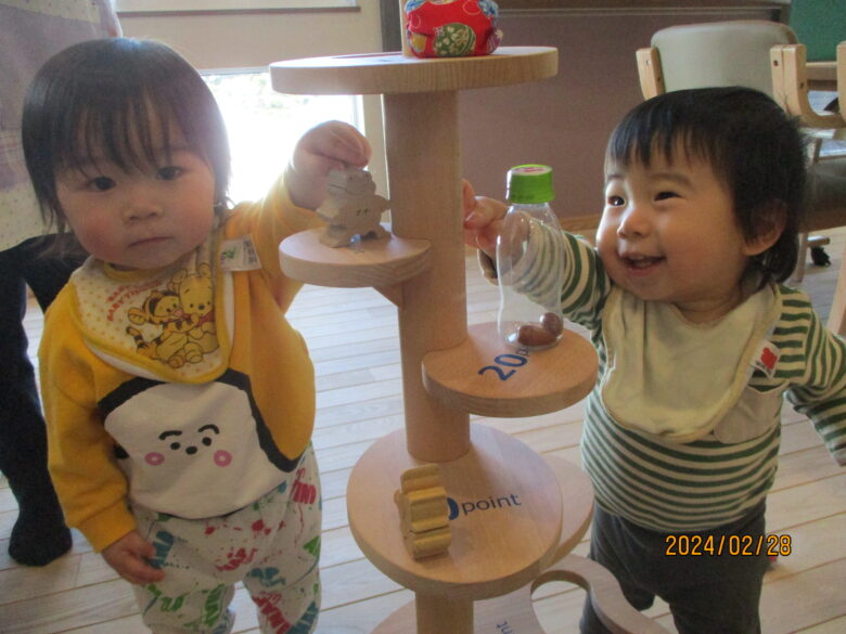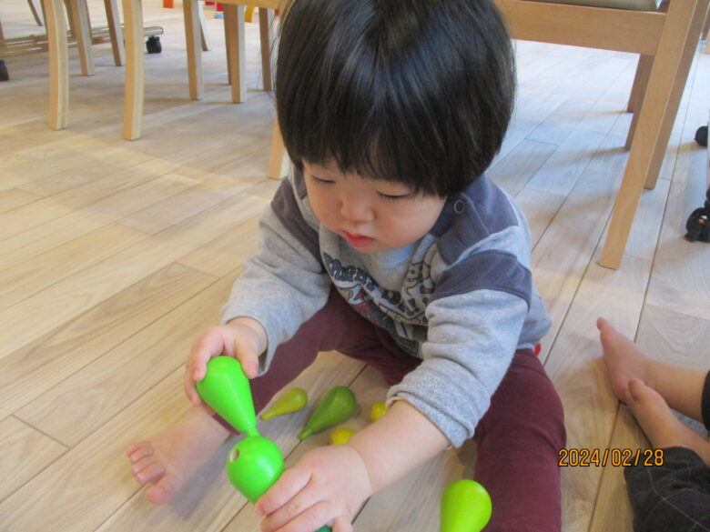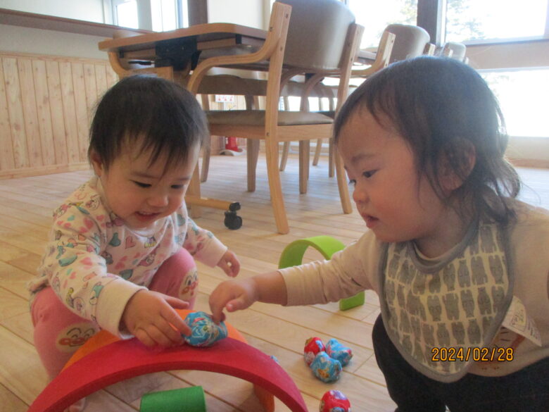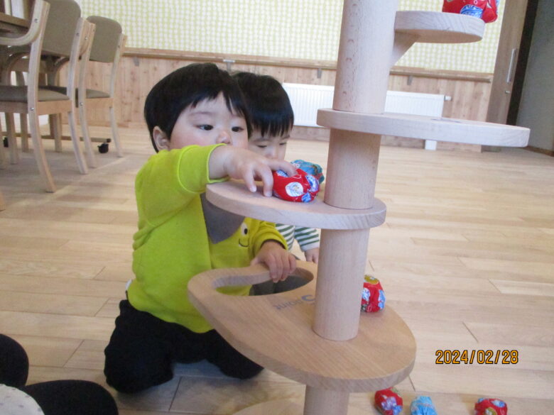 緩くカーブする木の上に、お手玉を置くとコロコロと転がることに気が付き、子ども達は何度も置いて変化を楽しんでいます。