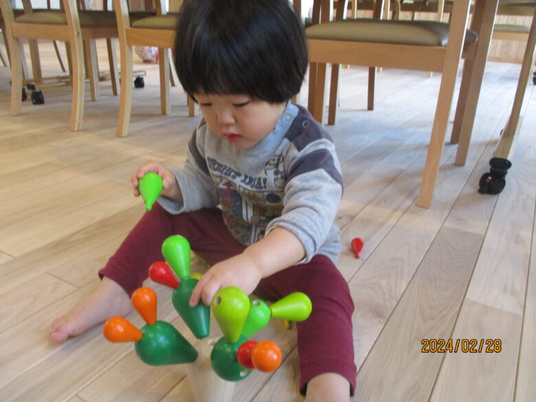 サボテンのバランスゲームでは職員に支えらえながら、子どもなりにどこへ付けようか考える姿が見られました。