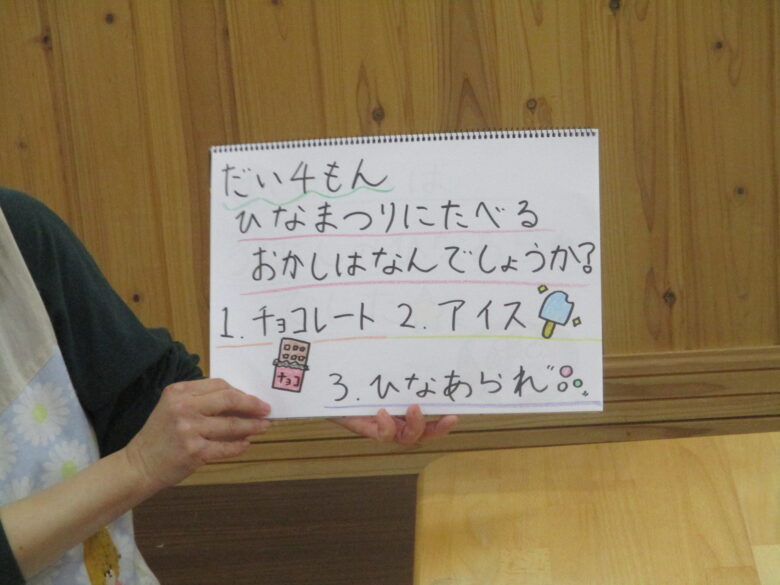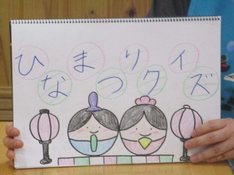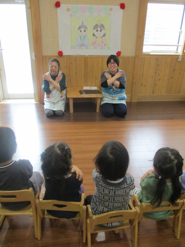 本日、ひなまつり会を行いました。 おひなさまにちなんだ手遊びをしたり絵本を見ました。 保育者による『ひなまつりクイズ』では保育者や友だちと「なにかな~」と考えている様子も見られましたよ。 日本の文化にふれた1日になりました。