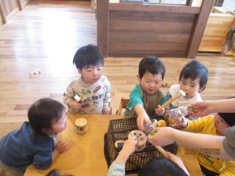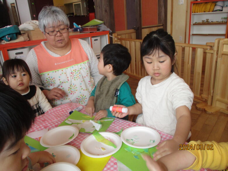 今日は、折り紙を千切り、木に葉や花を咲かせるところから始まりました。子どもの思う葉の色は様々で、黄色や緑色だけではなく水色が欲しがる子どももいました。冬の景色が思い浮かんだのでしょうか…!