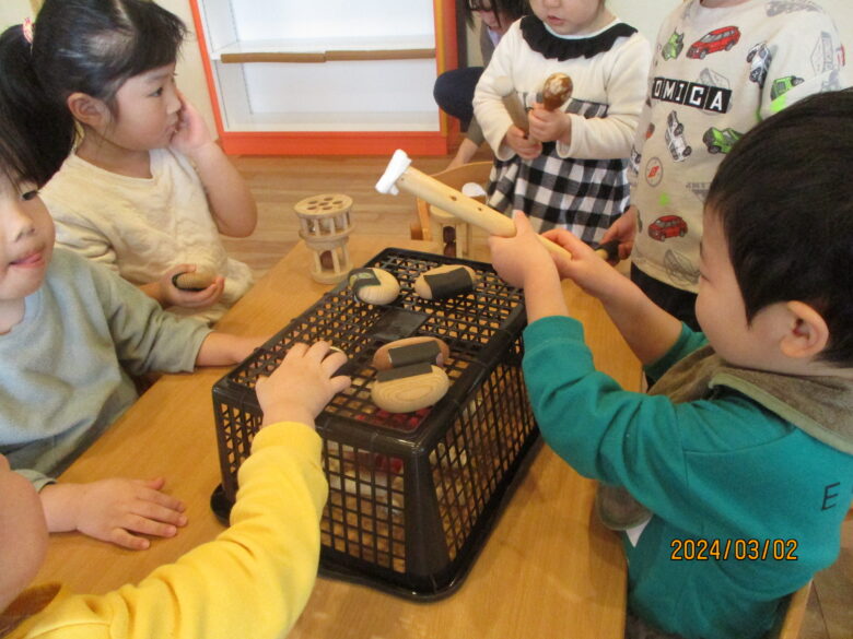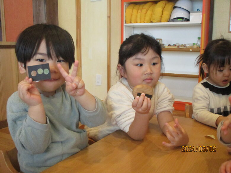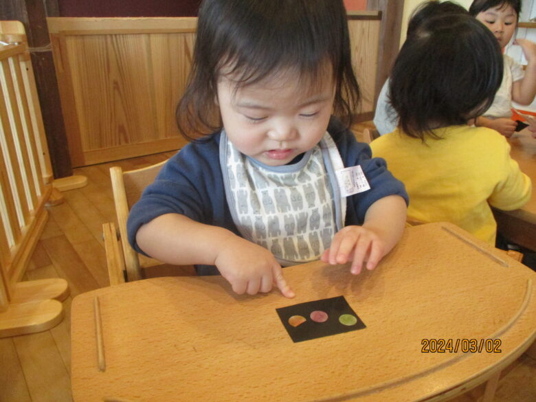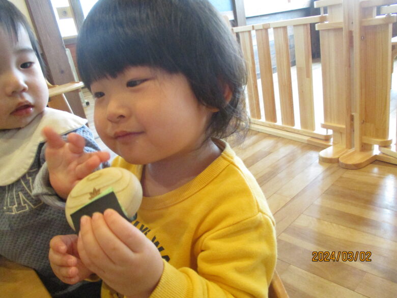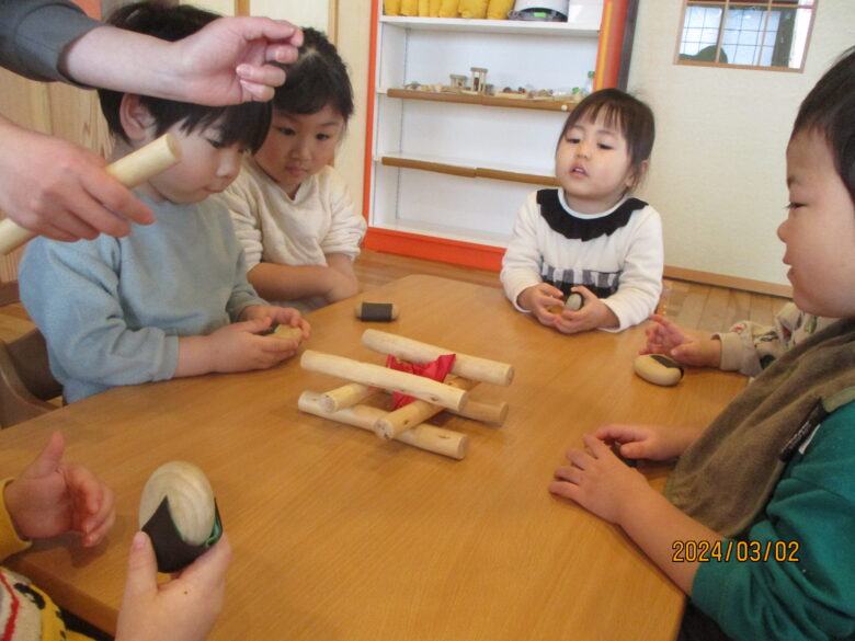 その後は、焼きおにぎり作りをしましたよ。まずは海苔の部分に、具となるシールを貼りました。それを木の玩具に貼って…。