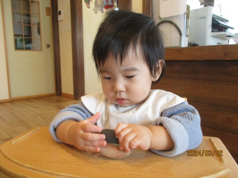 上手に焼けました!美味しそうな表情で食べる真似をしています。