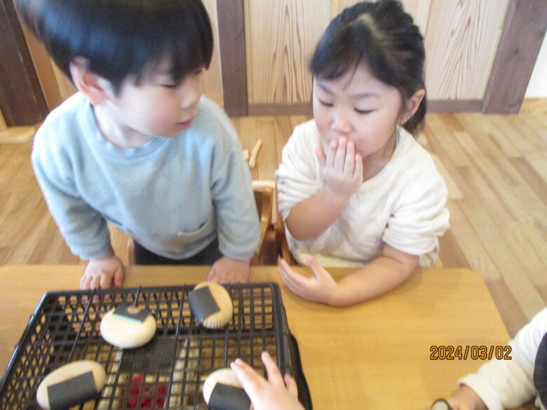 「焼けたかな?」「まだじゃない?」焼き加減の確認中です。