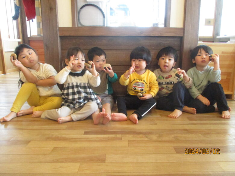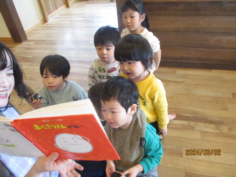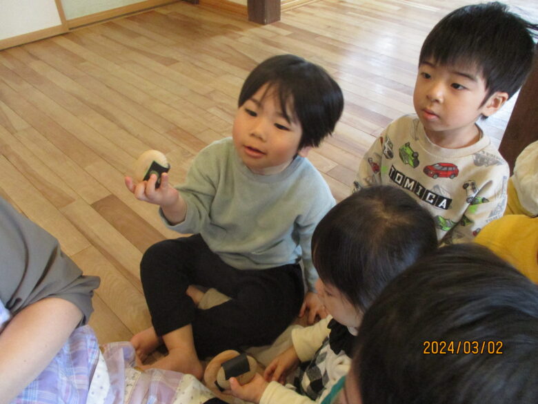 最後に、おにぎりの絵本を読んで本物の給食を食べに行きました。お腹はぺこぺこです。