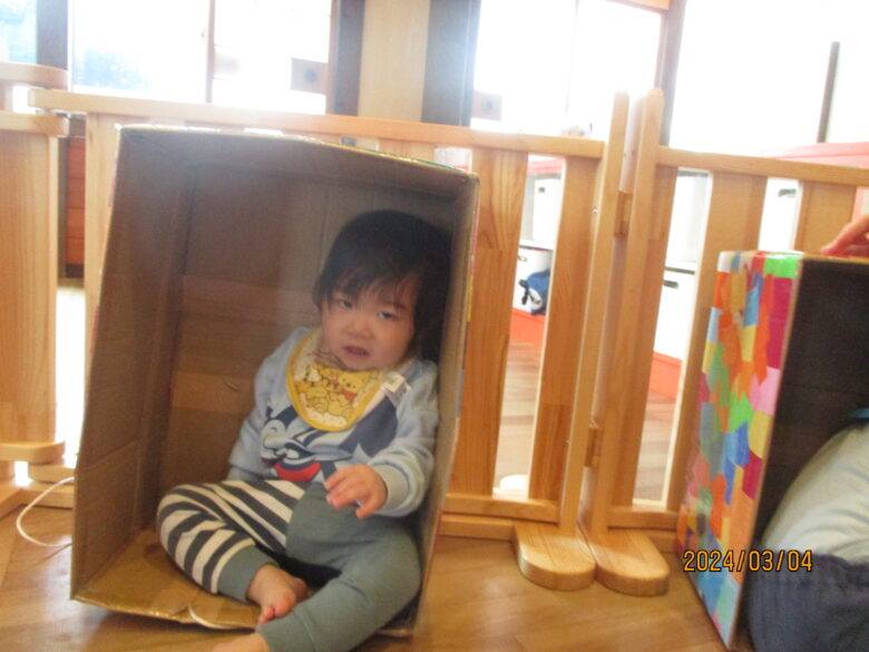 どんぐり組さんは段ボールのお家で遊んでいます。