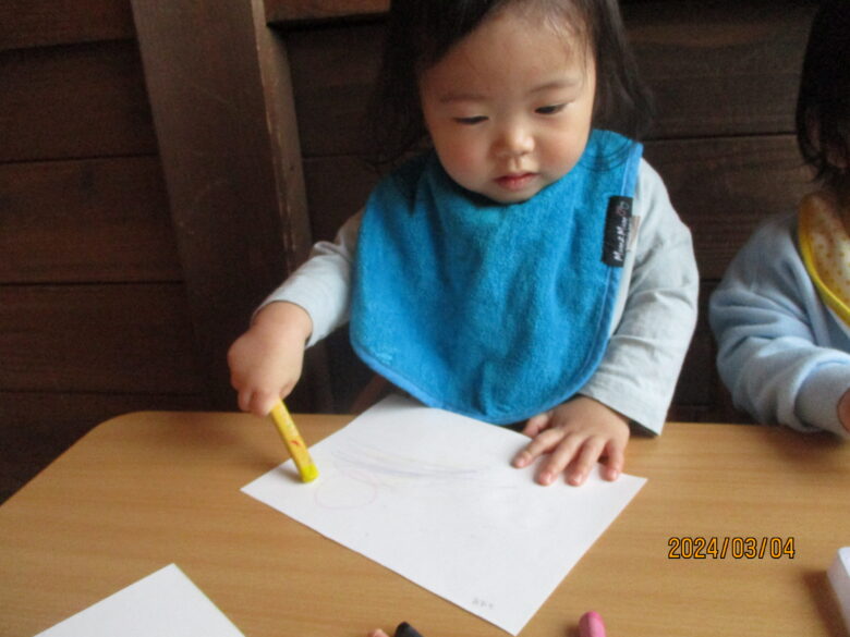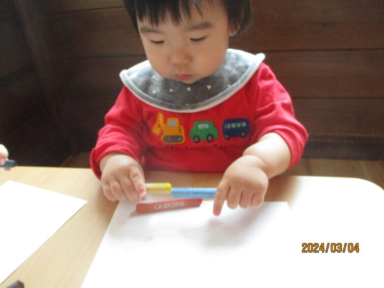 こちらはお絵描きをしています。上手にクレヨンを持ってお絵描きしていますね・・・。