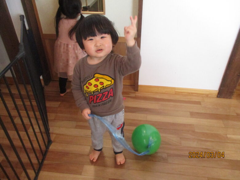 くり、くるみ組の活動は風船やビニールテープ遊び。風船にビニールテープを付けて犬の散歩に見立てて遊んでいる姿も見られました。