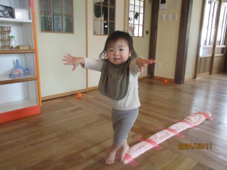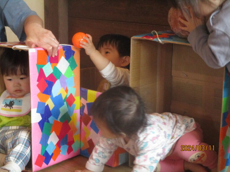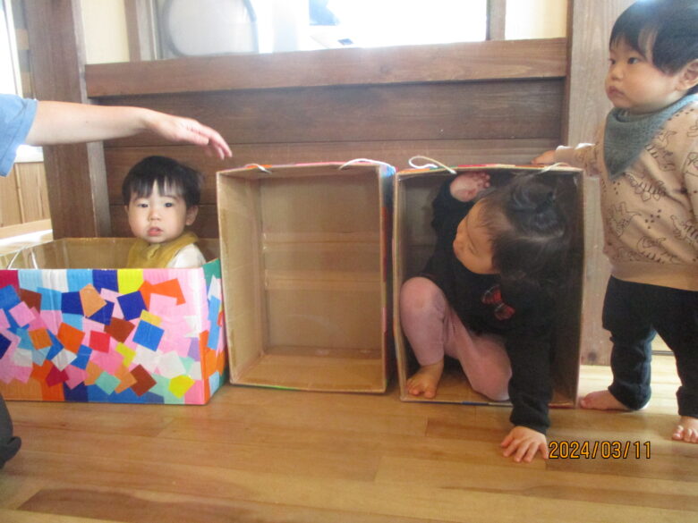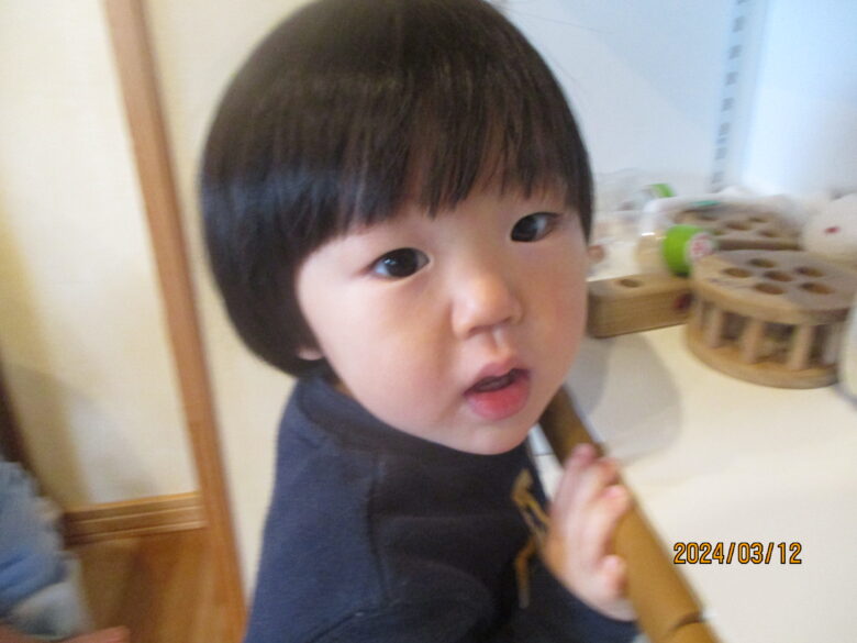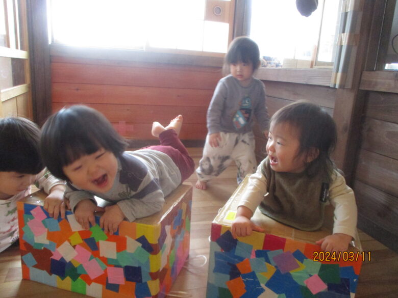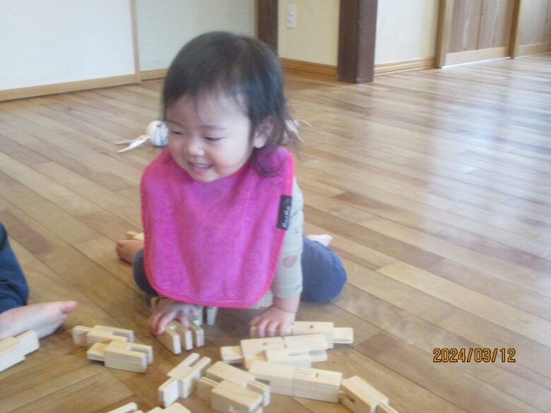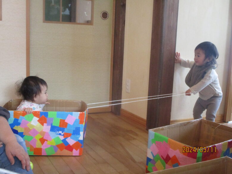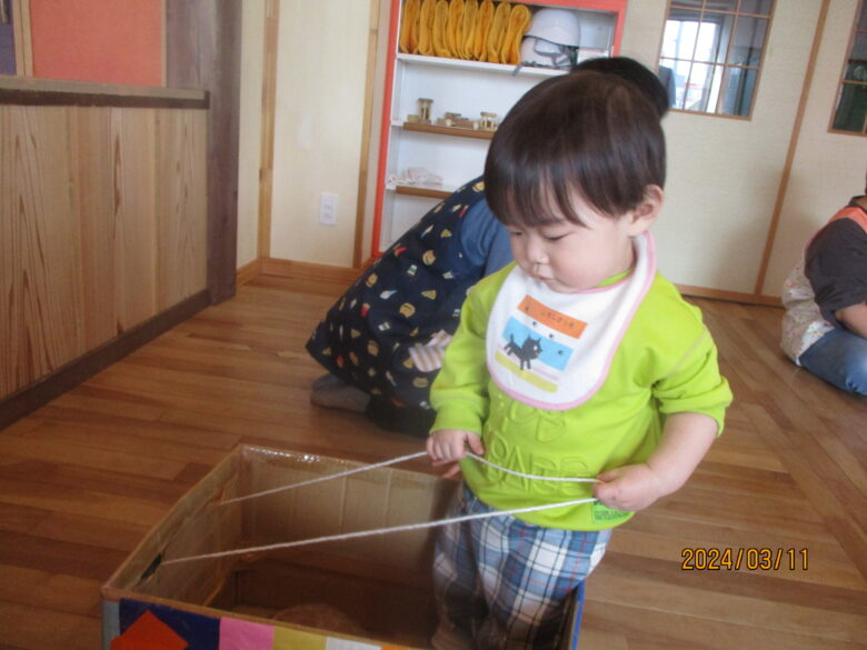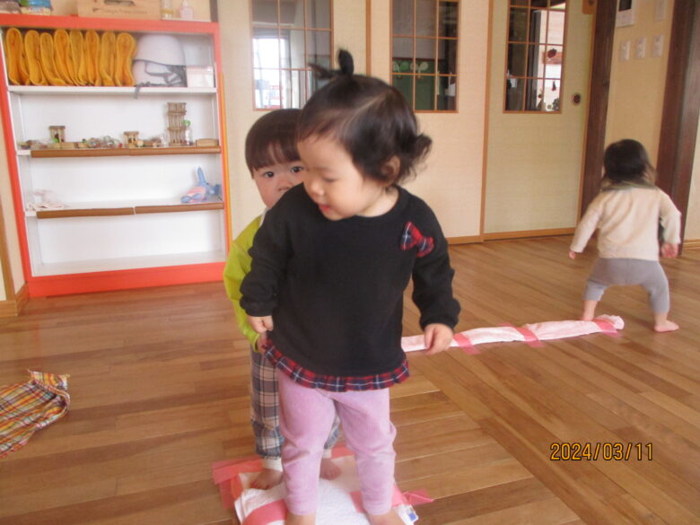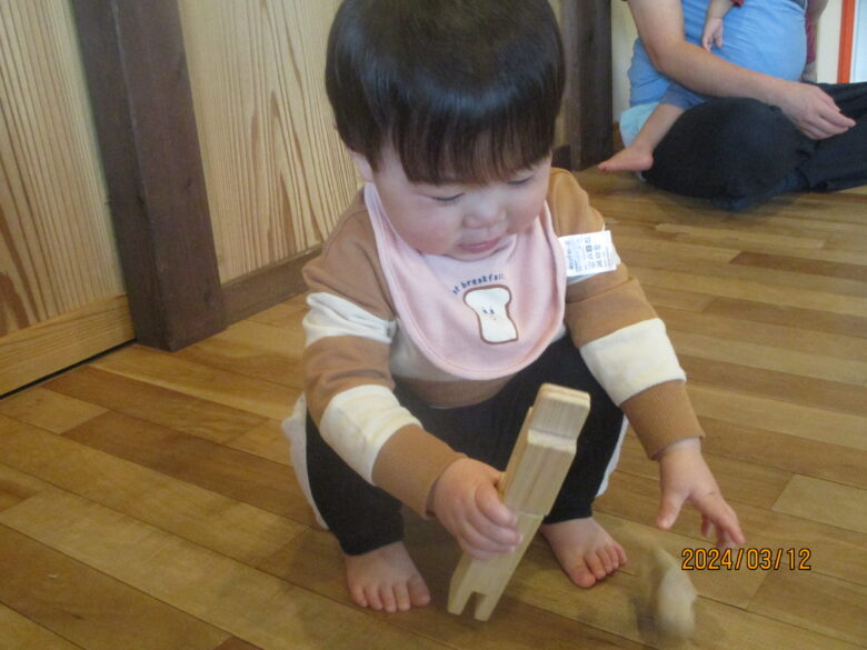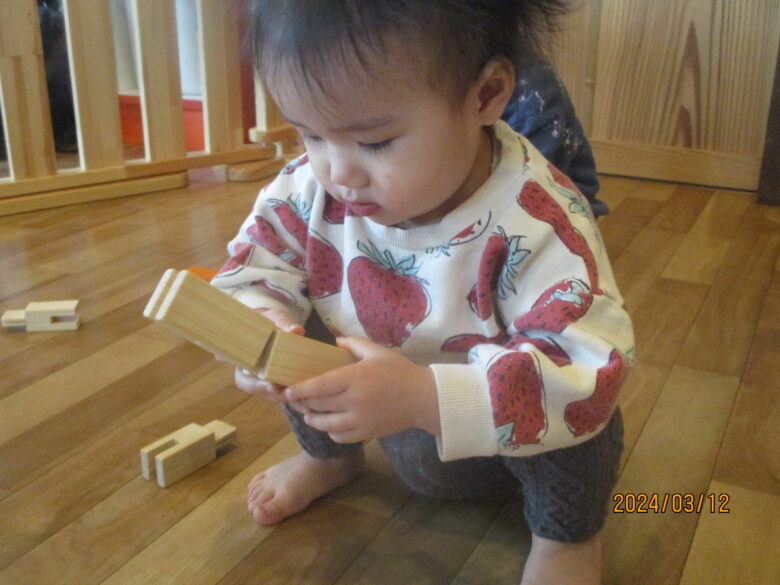 今日は、木づなで遊びました。くっ付けようと木と木を近づけています♪