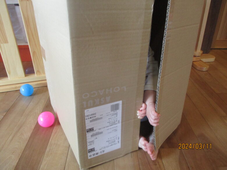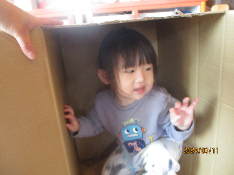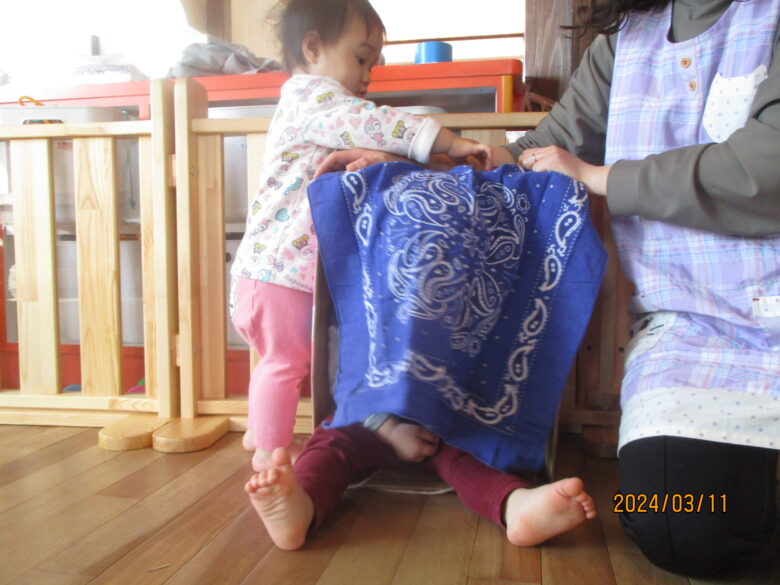 カーテンの中に隠れているお友達もいましたよ。家からはみ出る足がなんとも言えず可愛いですね。