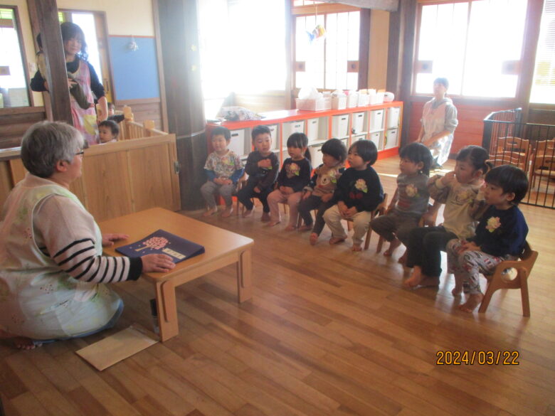 今日はくるみ組さんのお別れ会をし、みんなにお祝いしてもらいました。始めに園歌をみんなで歌いました。