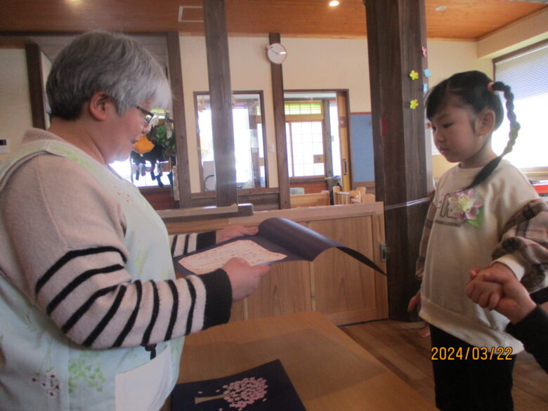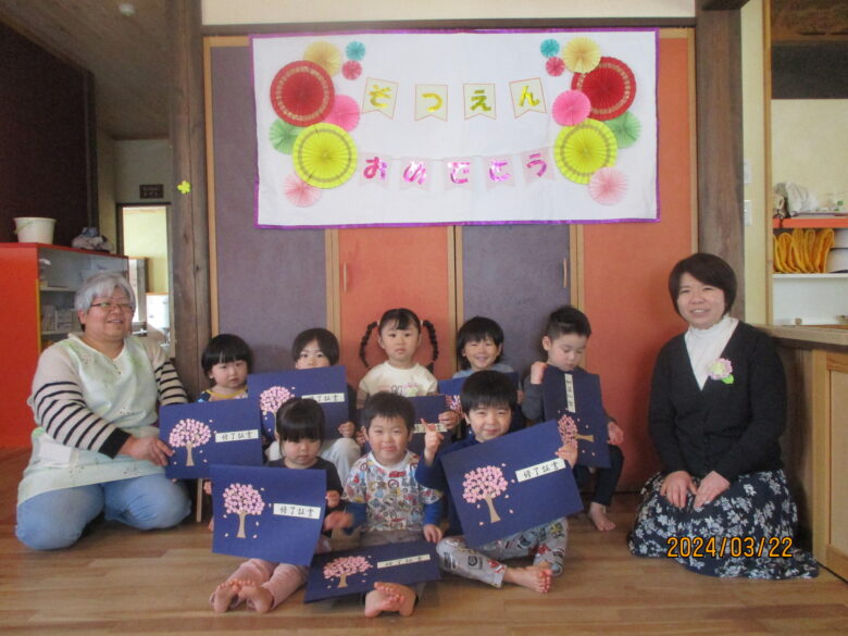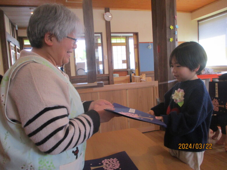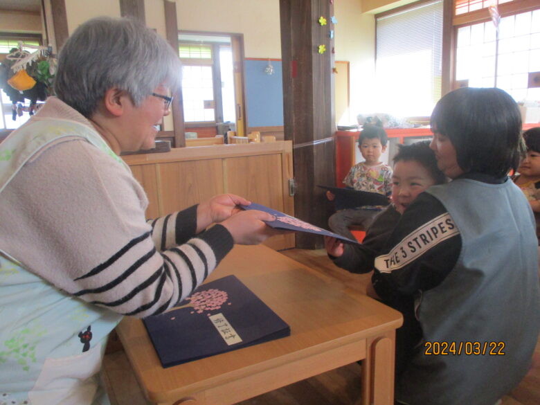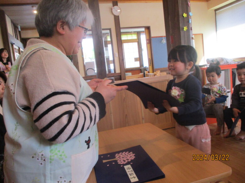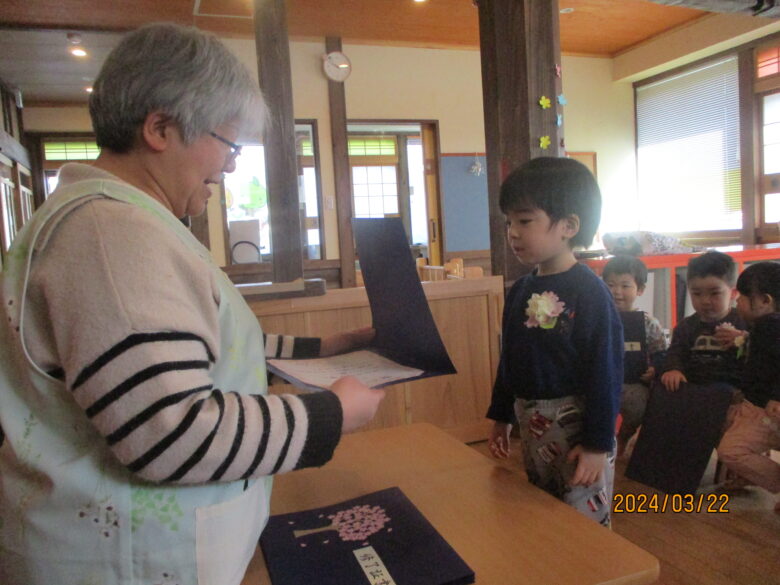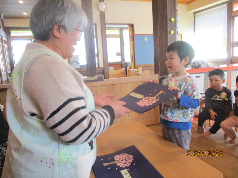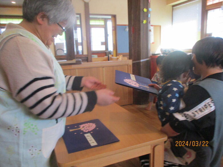 いよいよ終了証書を園長先生からもらいました。名前を呼ばれると元気に「はい!」と返事をする子や、緊張しているお友達については保育士と行くことで安心したようでした。終了証書をもらうと、とても嬉しそうな表情を見せてくれました。