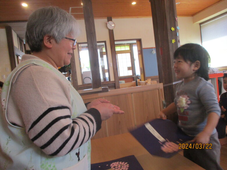 最後に園長先生からの出し物、手品を見ました。袋の中に何も入っていないのに、お花やバンダナが出てくるので驚いていました。