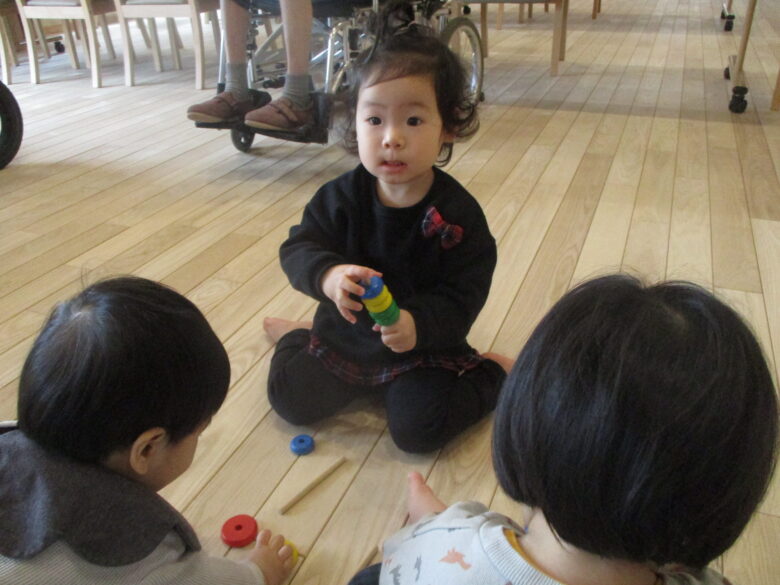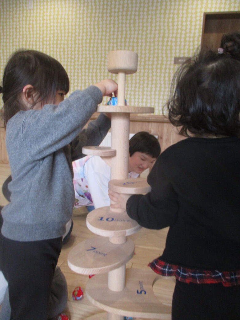 「だるまさんが」の絵本を見た後はお手玉や棒通しで楽しく遊びましたよ♪