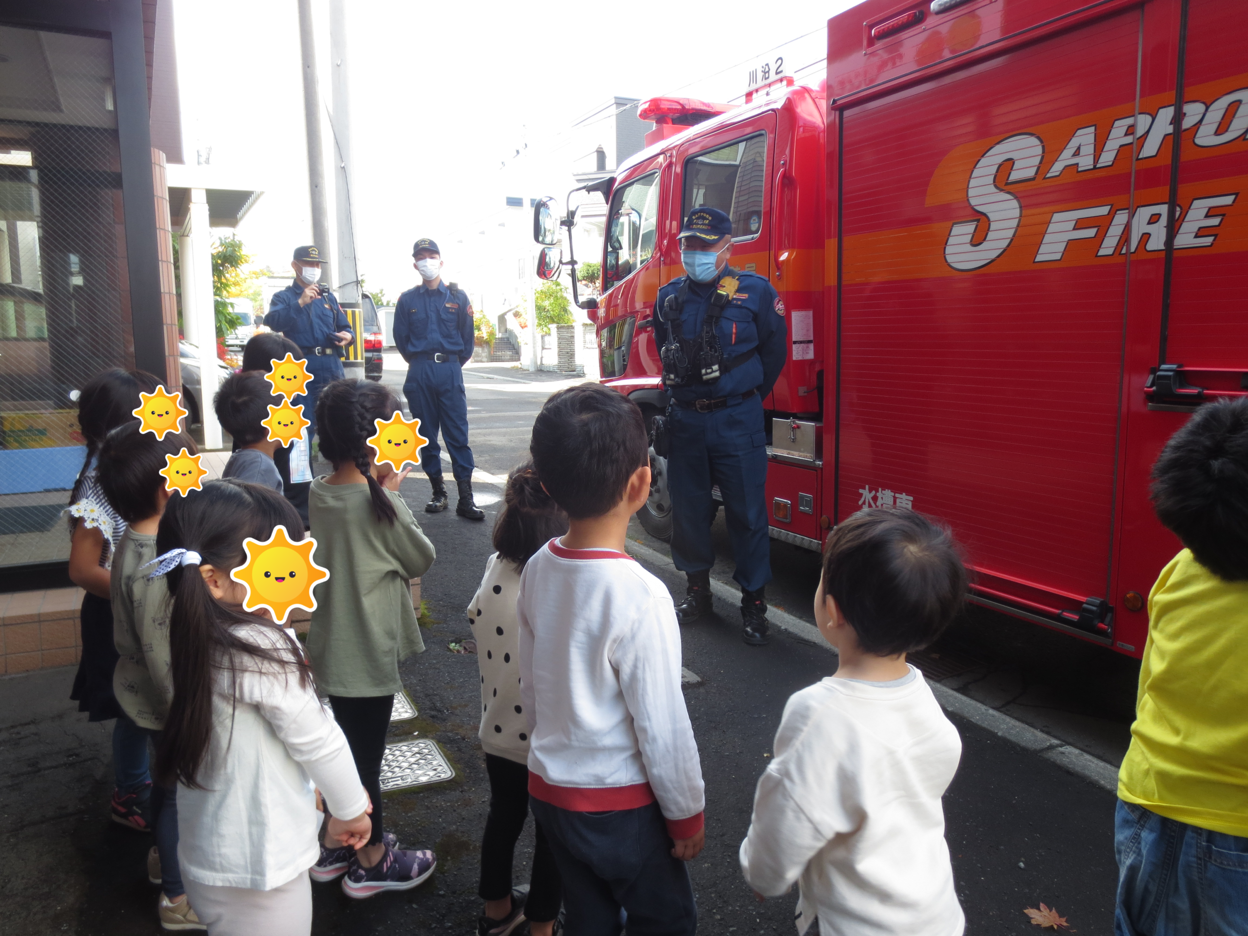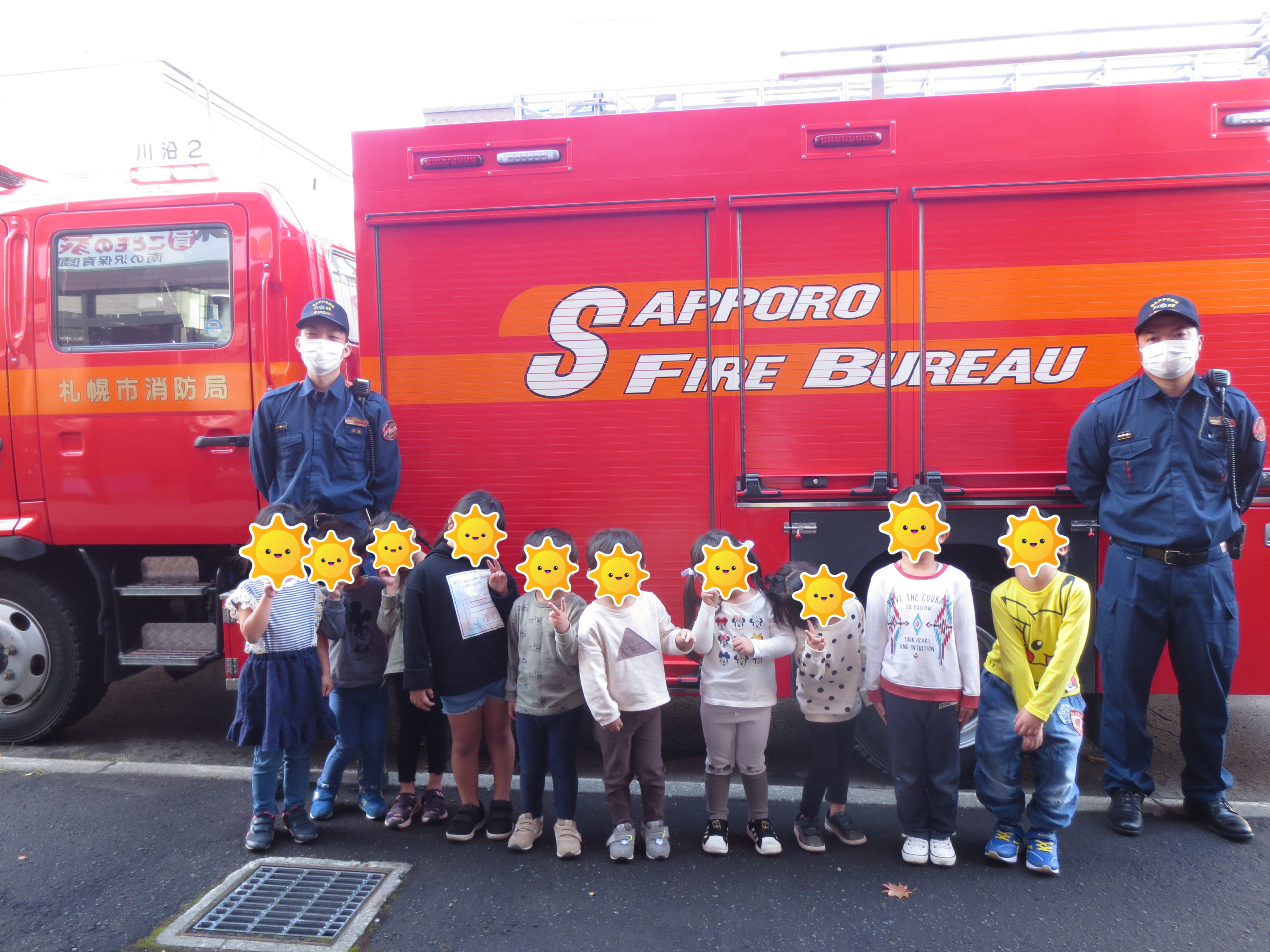 記念写真も撮ることができ、帰りには表玄関の前で停まってもらい、どんぐり・くり・くるみ組の子ども達も消防車を見ることができました。