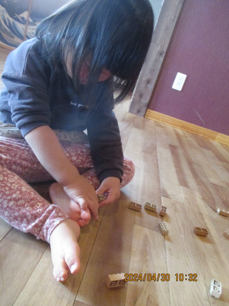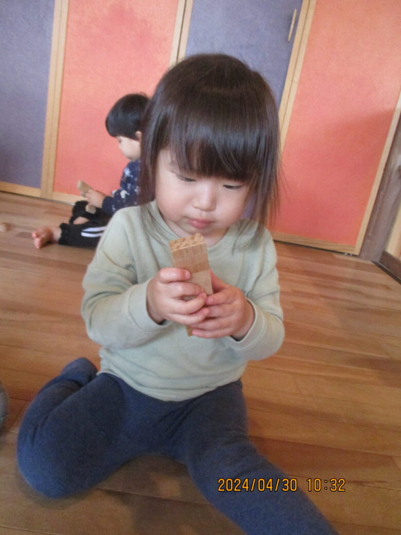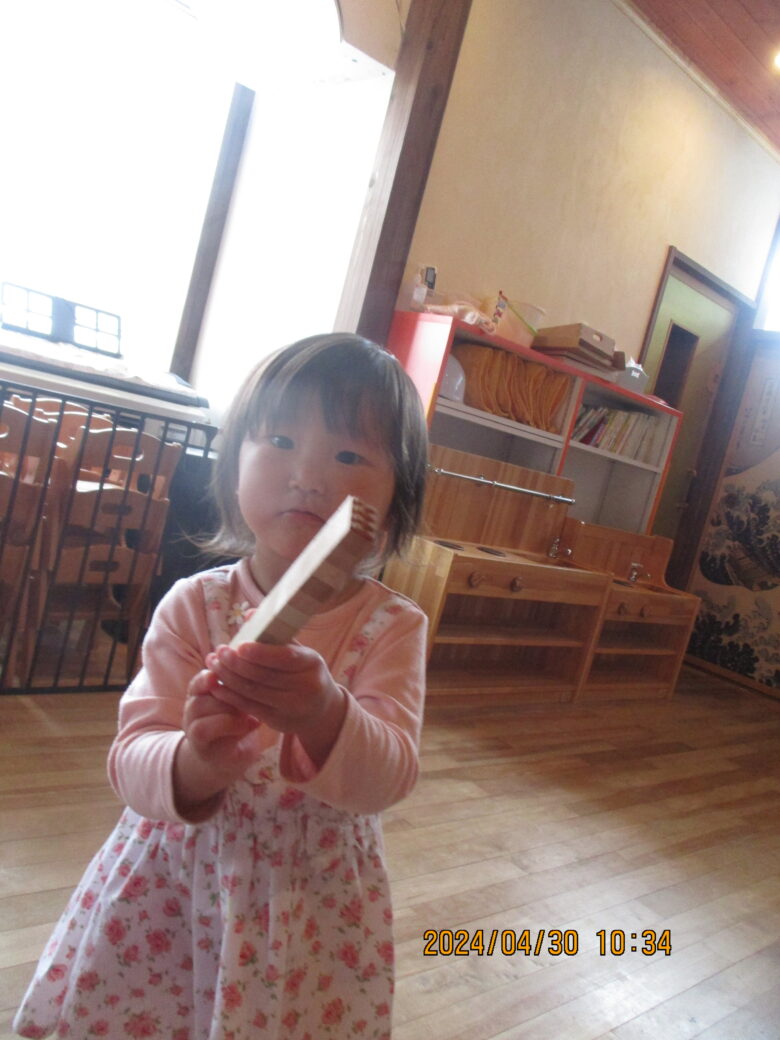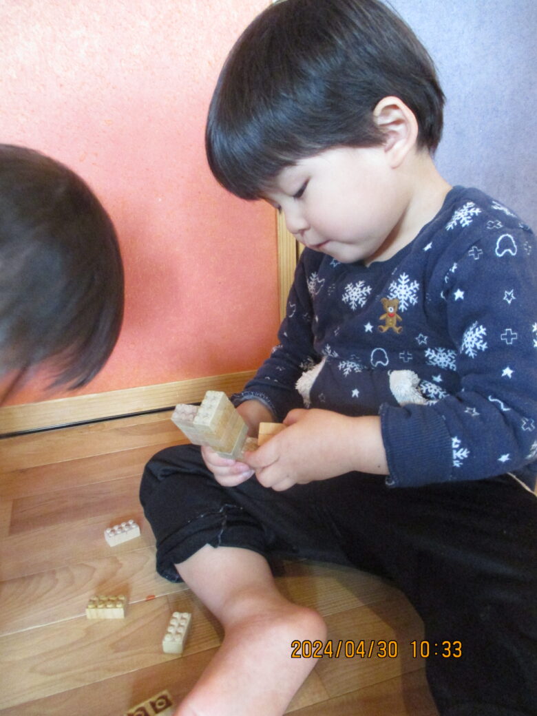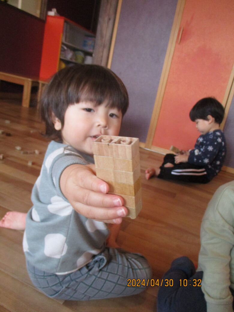 今日はくるみ組さん新年度初めてのクラス活動しました♪ ブロックでは一つ一つ重ねて色々な形を作っていたくるみ組のお友達。出来たら保育士に笑顔で見せてくれましたよ!!