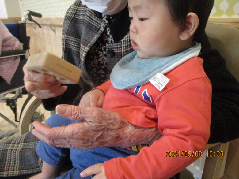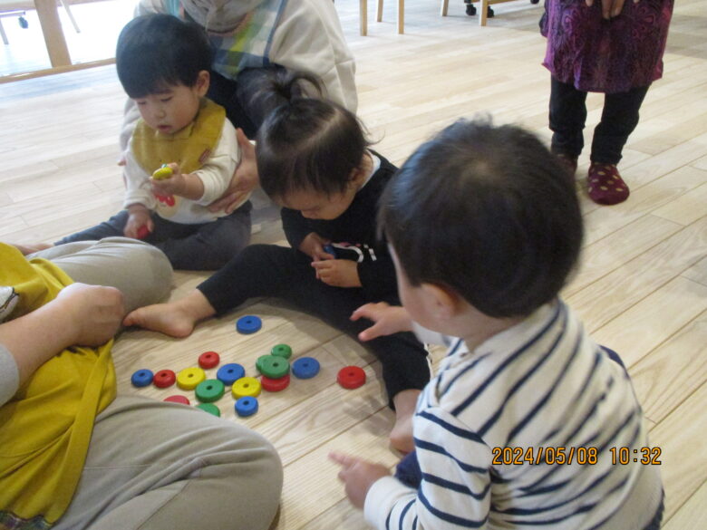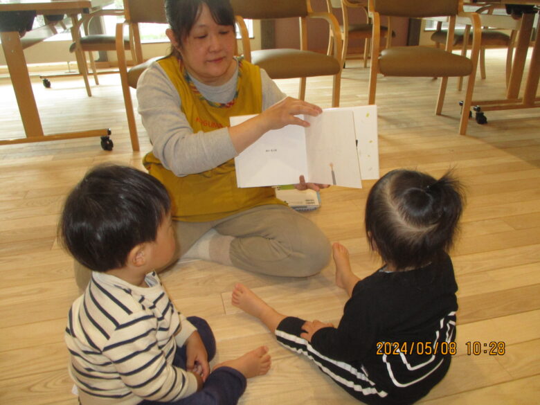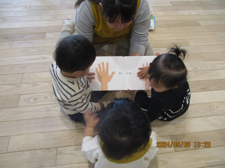 今日は、どんぐり組とくり組で無垢の家で遊んできました。手遊びや絵本を見ました。「はいたっち」の絵本が楽しくてみんなで絵本にたっちして楽しんでいました。絵本の次は施設の方たちともたっちもしてふれあいましたよ。