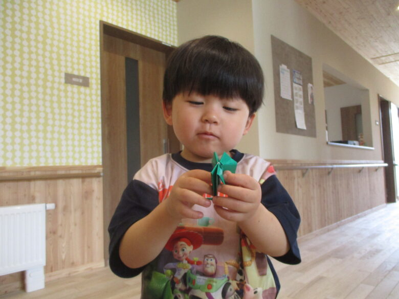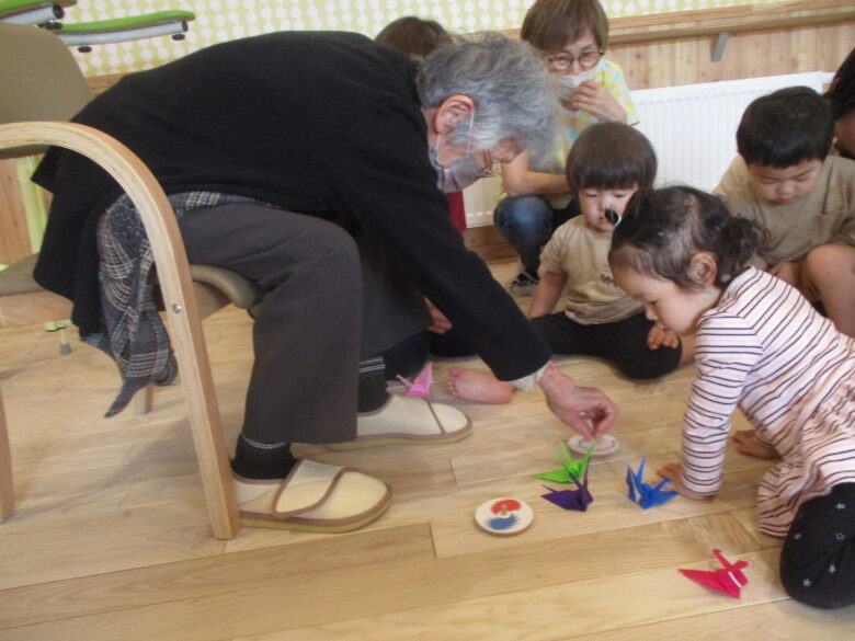 今日のくるみ組さんは久しぶりに無垢の家に行ってきました。 利用者さんから鶴の折り紙を貰い嬉しそうな子ども達。