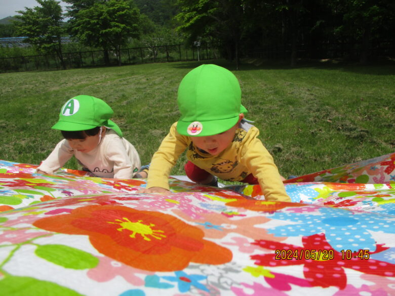 レジャーシートの上を上手にハイハイをしています。坂になっているのでバランスが難しいですね。