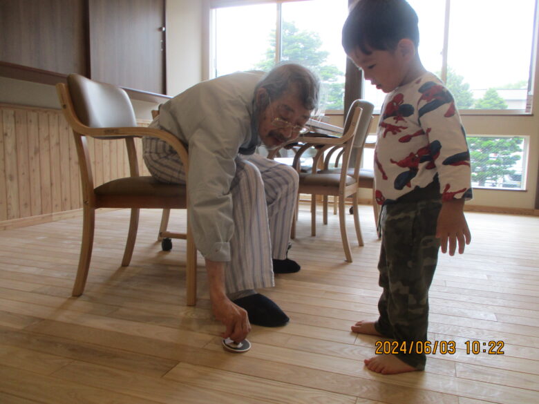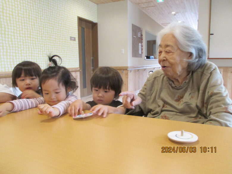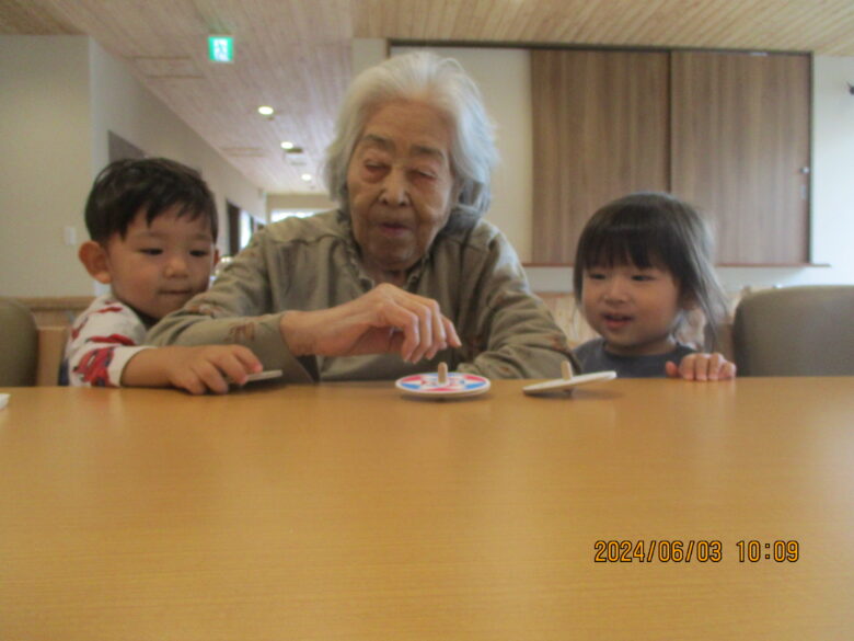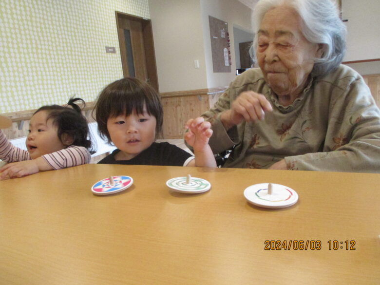 利用者の方がコマを回している姿をじっと見ていたり、利用者さんの隣に行き一緒に回している姿が見られました。