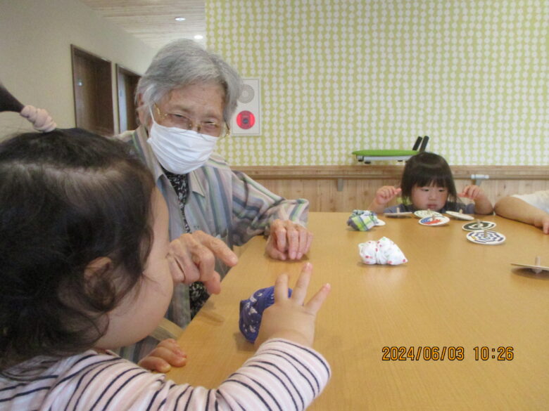 今日のくるみ組さんは、無垢の家に行き遊んできました。無垢の家に着くと、「おはよー」と元気に利用者の方に挨拶をしていましたよ。