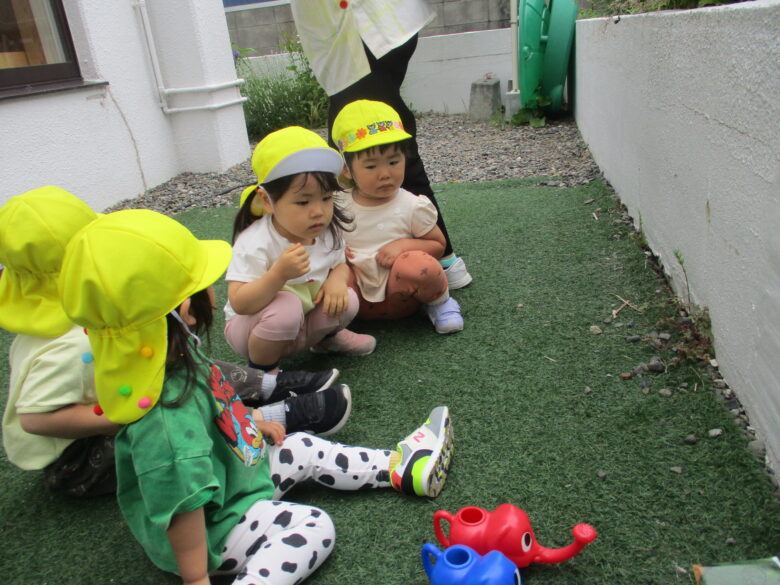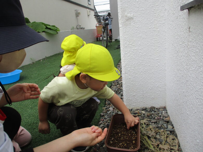保育士の話をよく聞いて、順番に土に種を植えていき、お水を撒きました。