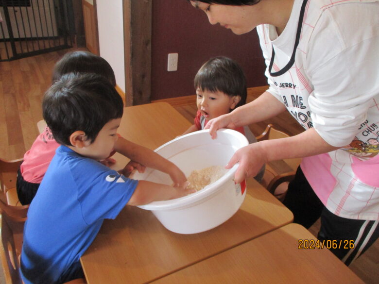 今日のくるみ組の活動では小麦粉粘土をしました。 小麦粉の感触を味わった後、水を入れて粘土を作りました。
