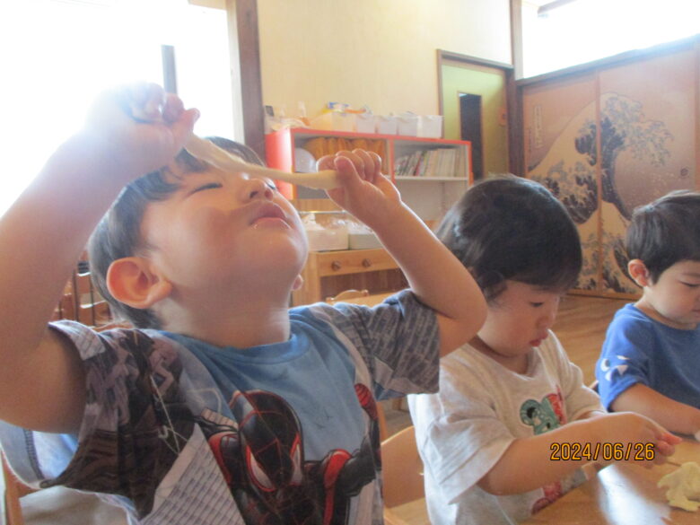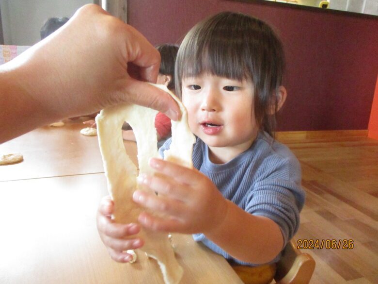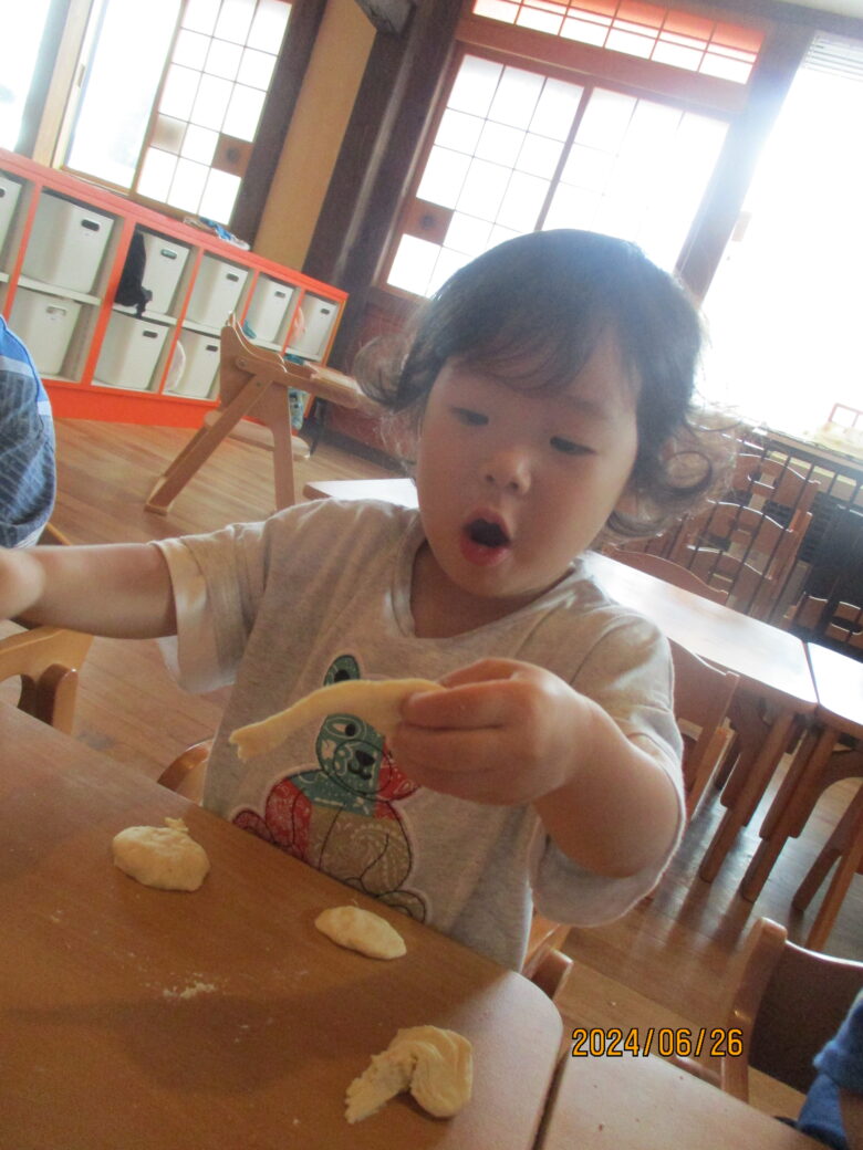 粘土を配ると、丸めたりのばして楽しく遊んでいましたよ♪