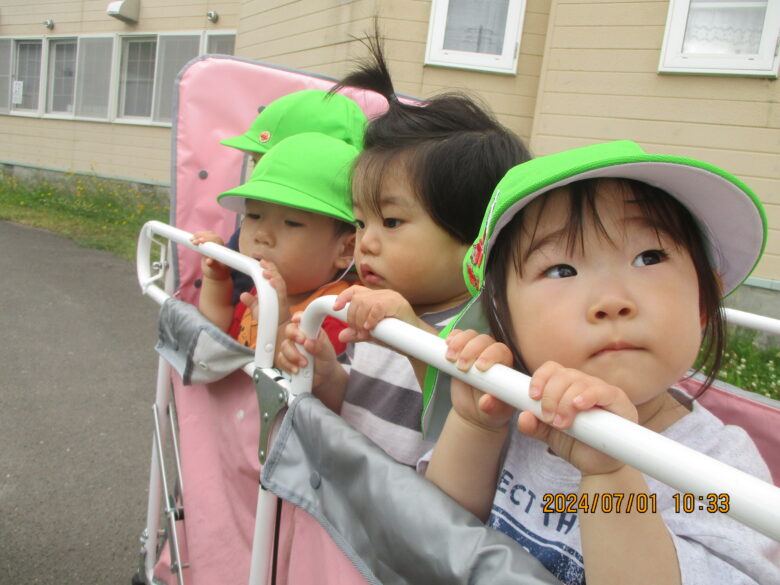 保育士と歌いながら楽しんでカートに揺られる姿がありました♪