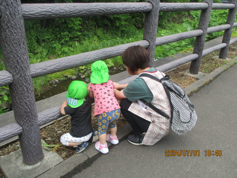 風が心地良い中、保育士と一緒に流れる川をにこにこと眺めて楽しむ姿です♪