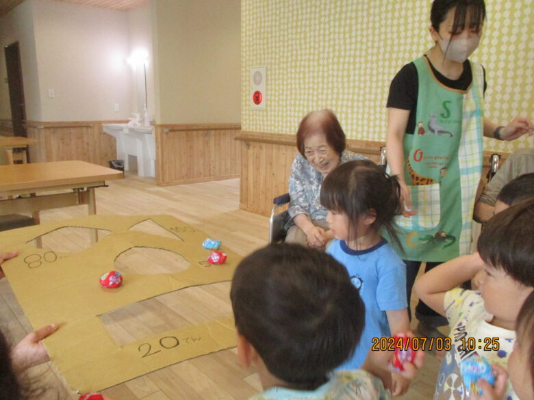 今日のくるみ組さんの活動は無垢の家に行き段ボールの穴の中にお手玉を入れ、的当てをして遊びました。