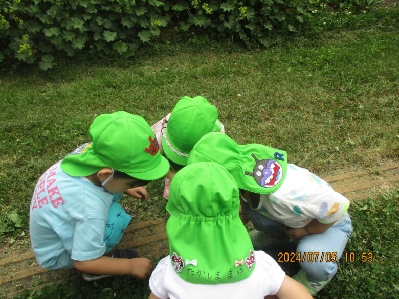 公園の遊歩道ではアリさんを観察している子ども達です。