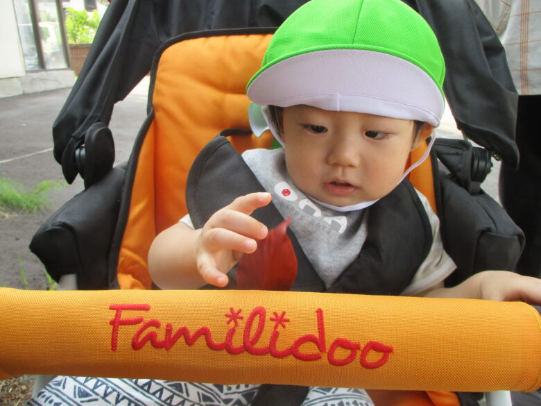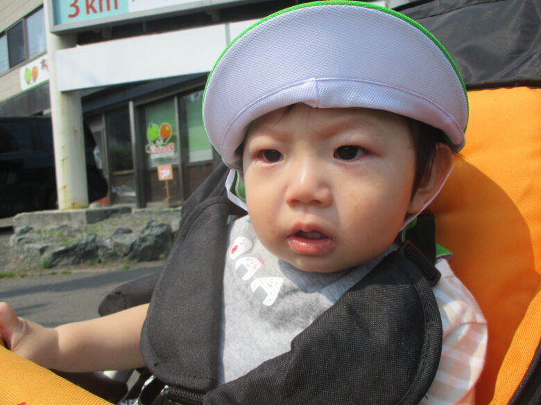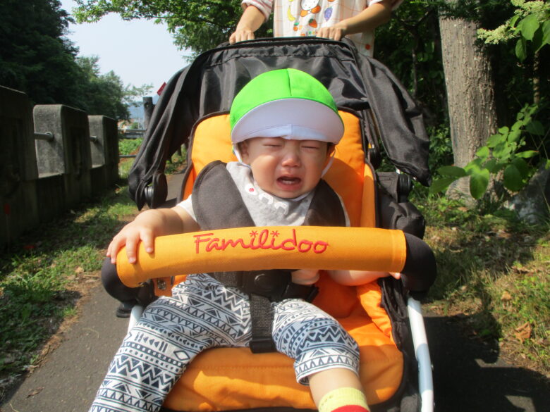 途中ベビーカーが止まると、「とまらないでー」と涙。動くとご機嫌に。