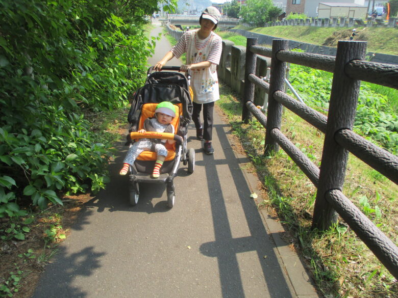 今日は保育園の近くにある川沿いから、ぐるっと回ってきました。ベビーカーに乗って出発!