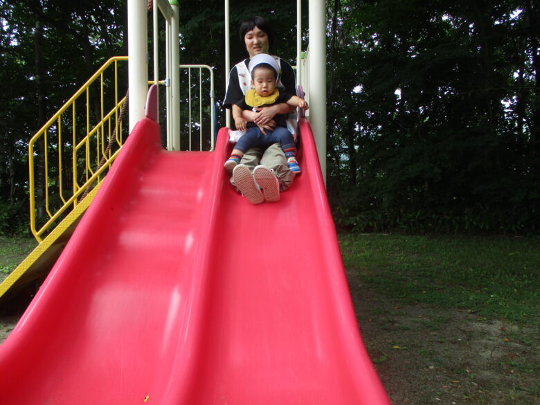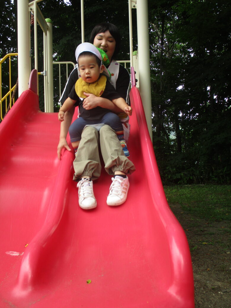 滑り台も保育士と一緒に滑って楽しみました。