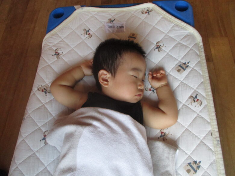 保育士が「帰るよ」と言うと、まだ遊びたかった様子です。