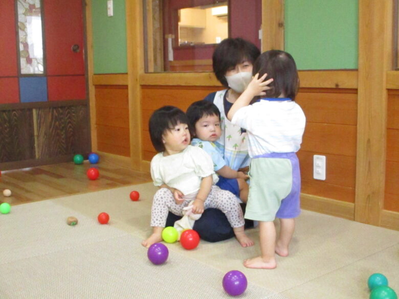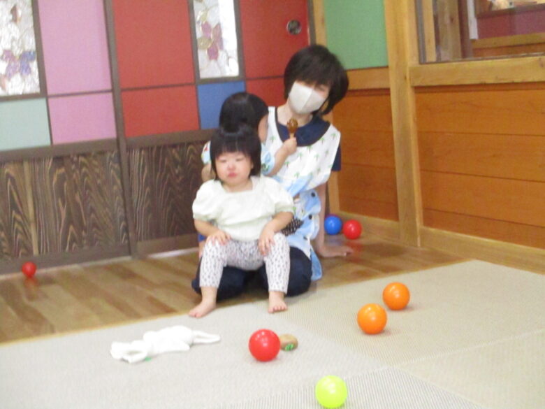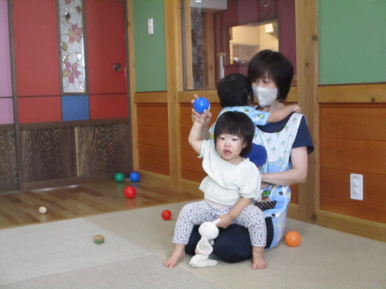 ボールを目で追ったり、握ってみたり、投げてみたり、色々な色がある為、視覚的にも様々な刺激を受けている子どもたちですよ👀👏