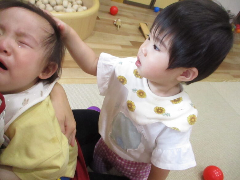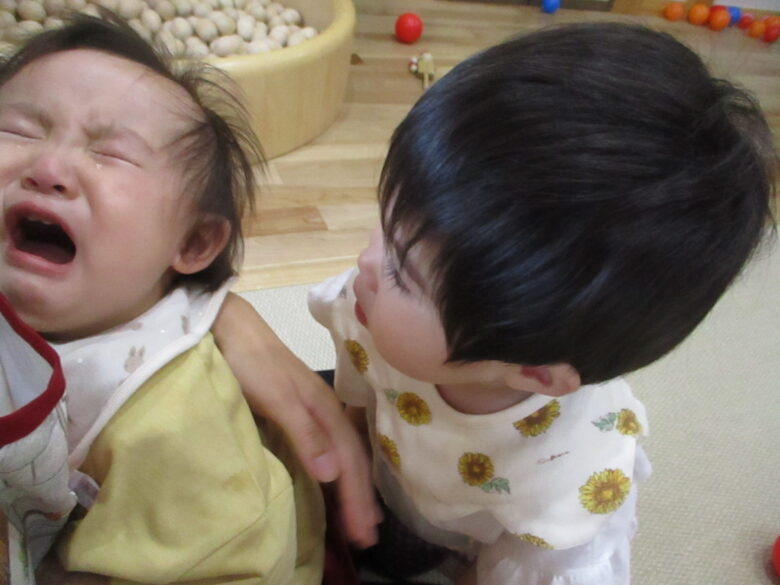 くり組のお友だちが泣いているどんぐり組のお友だちを心配して顔を覗き込んでいます。