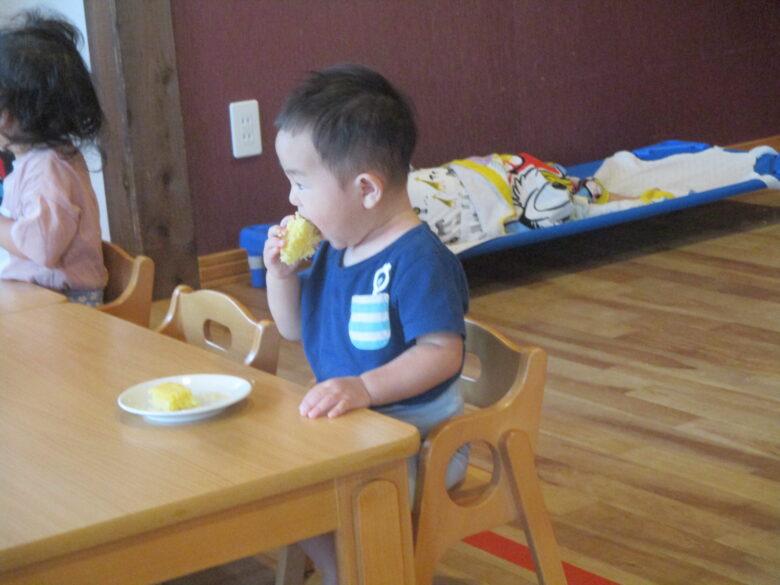 お昼寝の後はおやつタイム。美味しそうにモリモリ食べていました。