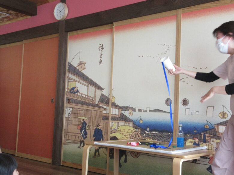 お話を聞いた後は七夕マジック!!<br /> 天の川からとってきた水をコップに入れると・・