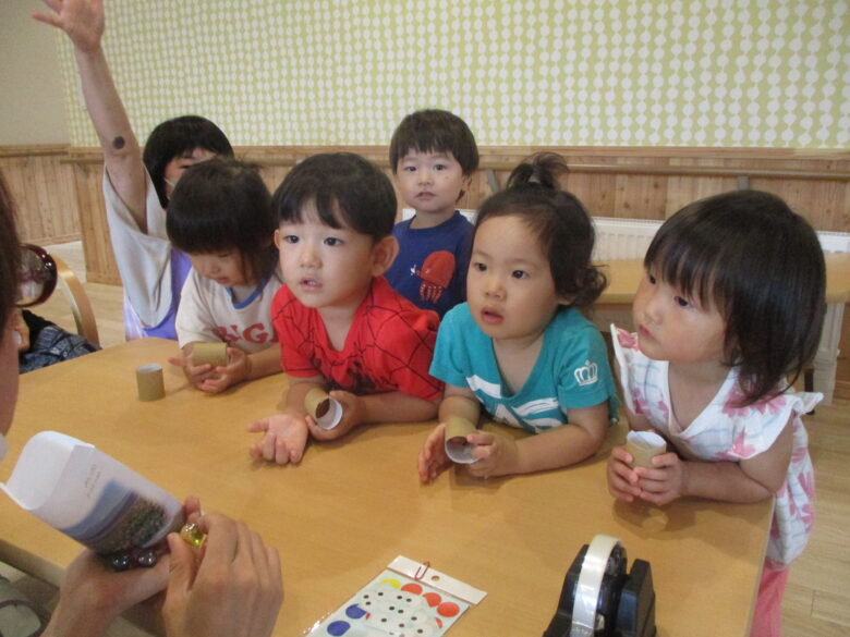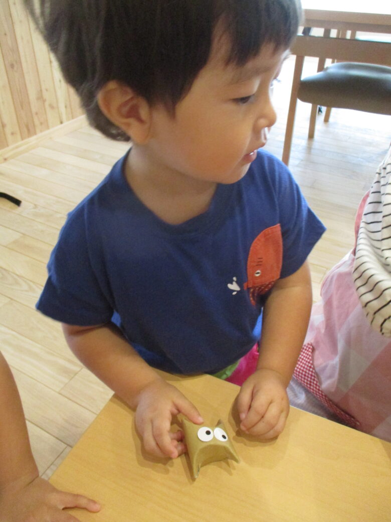 トイレットペーパーの芯の中にビー玉を入れ蓋をし、目や口のシールを貼りました♪
