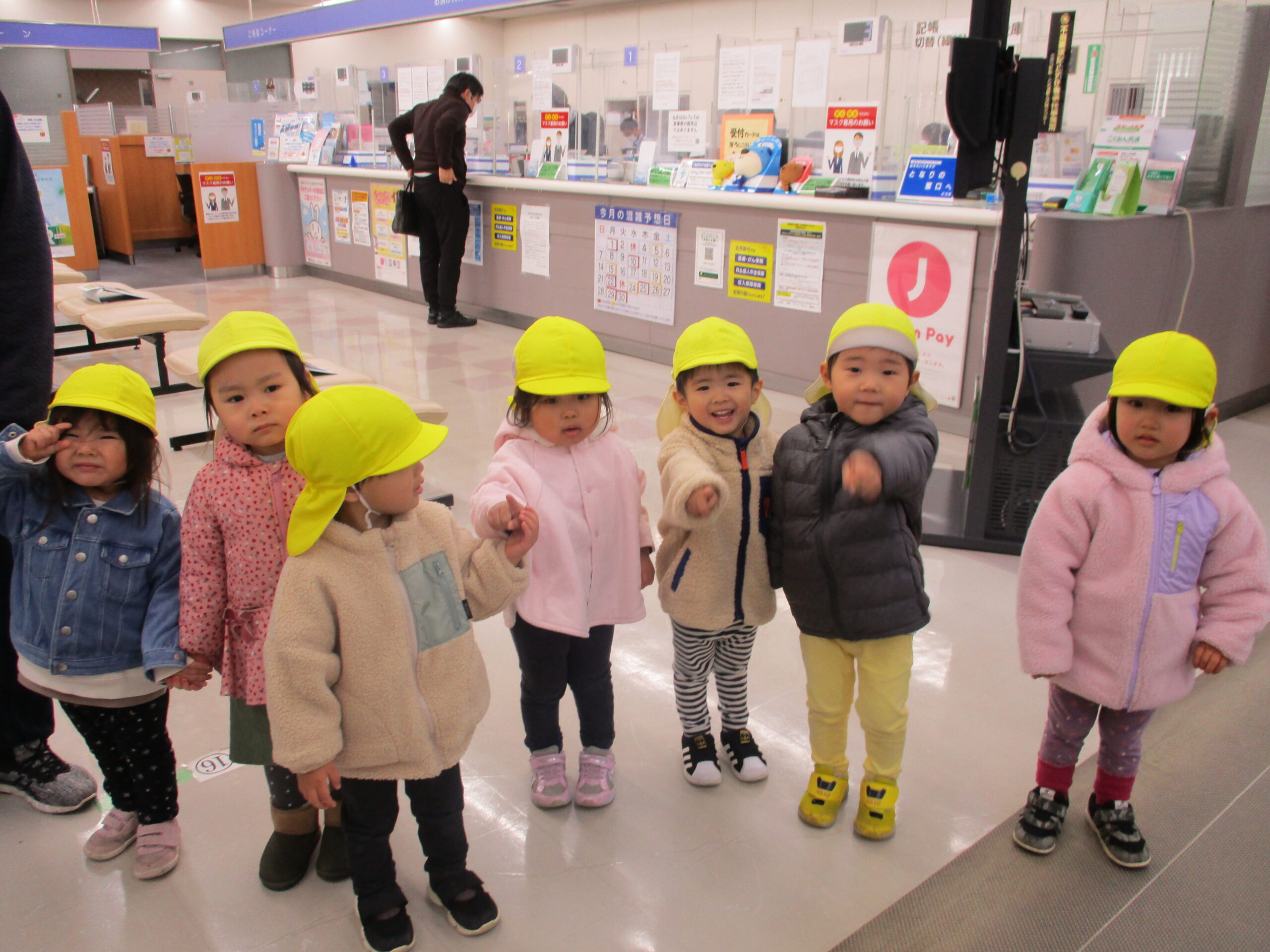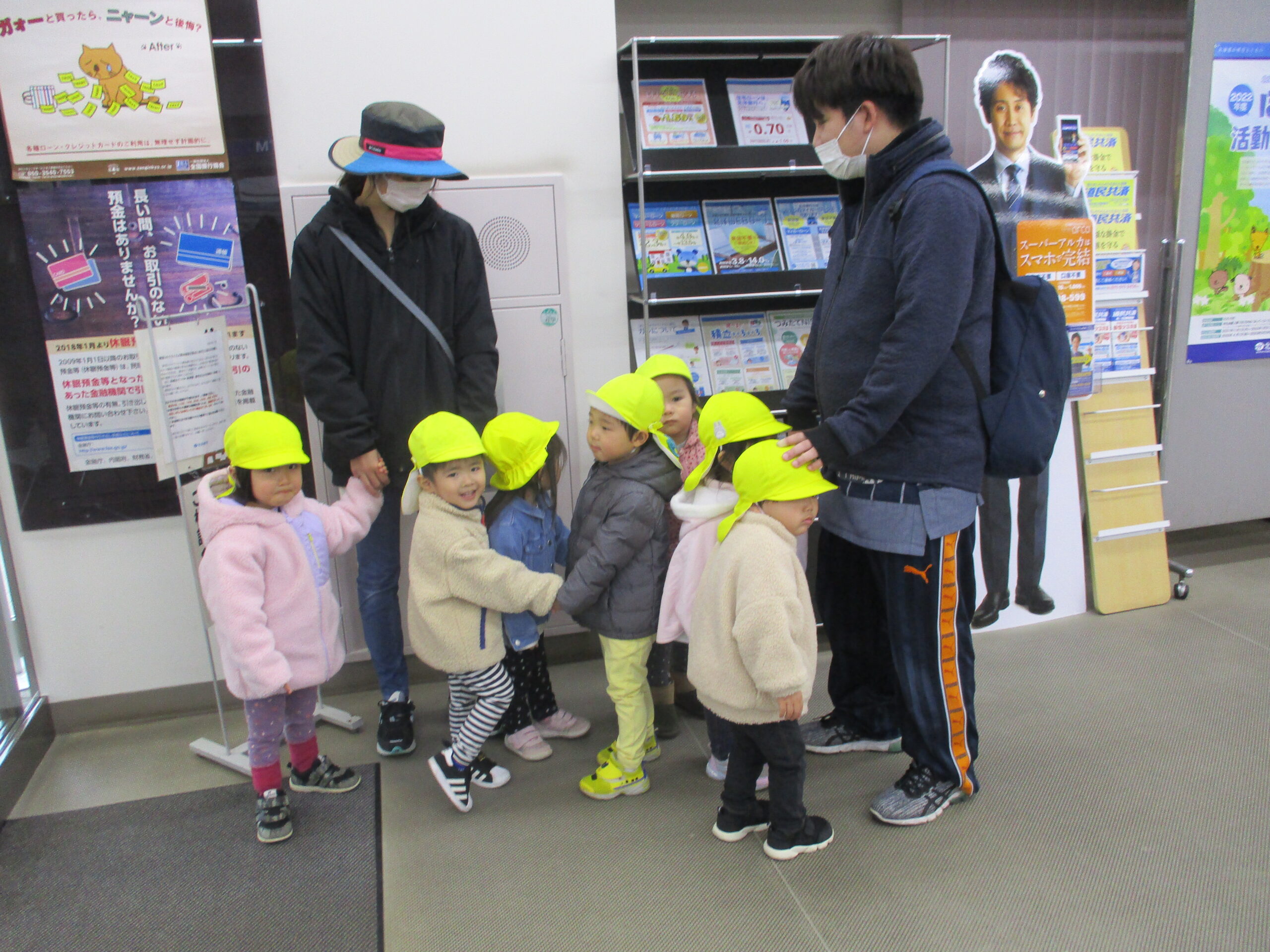 今回の避難訓練は、外で変な人が近づいてきたら・・・の設定でした。 近くの北洋銀行さんにご協力をいただき、銀行内に避難するという計画。 保育士のいつもと違う行動に、子どもたちもドキドキ・・ 静かに避難、待機することができました。 訓練が終わった後は、銀行内をぐるっと一周させてもらい、プチ社会科見学でした。 記念にパシャ📷 みんな良い笑顔です!